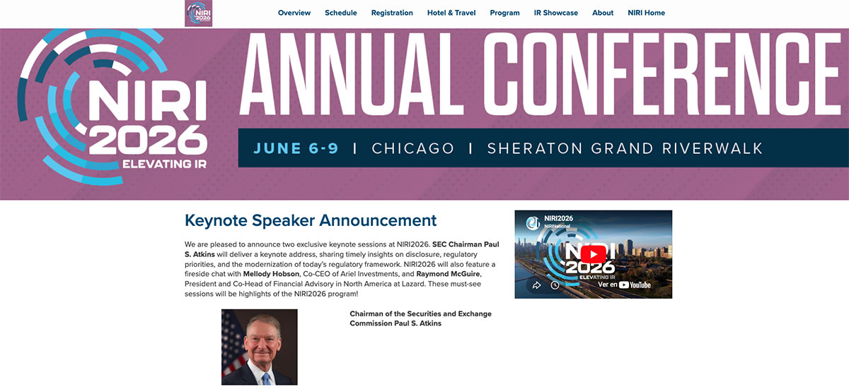 La Conferencia Anual de NIRI 2026 será el punto de encuentro clave para la comunidad de relaciones con inversores, reuniendo a profesionales de todo el mundo para reforzar el papel estratégico de este role sus organizaciones. Del 6 al 9 de junio de 2026, el Sheraton Grand Chicago Riverwalk acogerá debates sobre las tendencias que están redefiniendo los mercados de capitales, la comunicación corporativa y las expectativas de los inversores.
